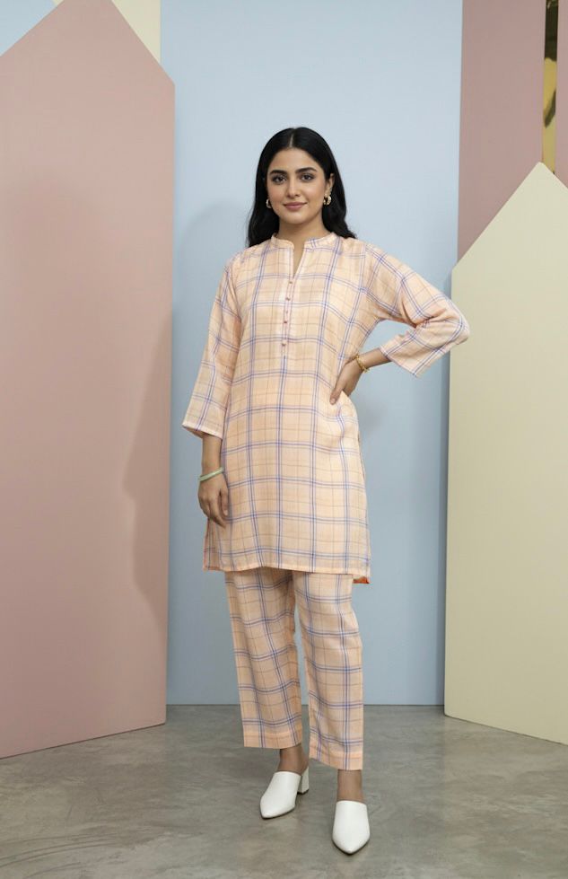 Radiate warmth and charm with our Peach Glow two-piece set, crafted from premium soft lawn fabric for breathable comfort and effortless grace. The soft peach base paired with delicate blue check lines brings a perfect balance of freshness and sophistication.